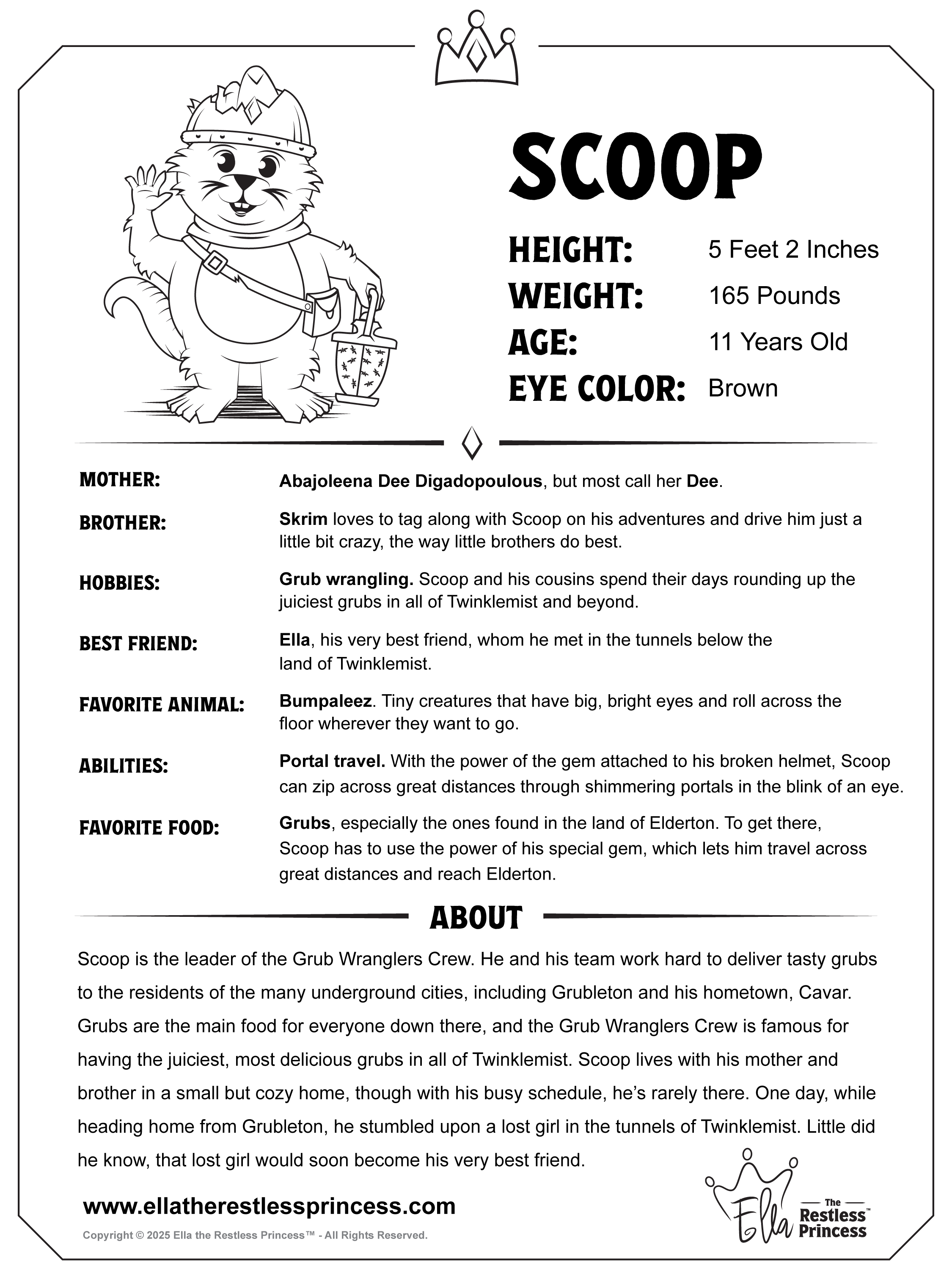 Ella is the most restless little girl in all of Elderton. Even with dozens of toys scattered around her bedroom, the spark of restlessness inside the little princess continues to burn. She loves spending time with her mother and father, but they are often busy with castle duties and cannot spend as much time with her as she would like. One day, Ella discovered the Shadowy Path, and her restlessness began to fade as she found new and exciting adventures to fill her days and a wonderful new friend named Scoop.