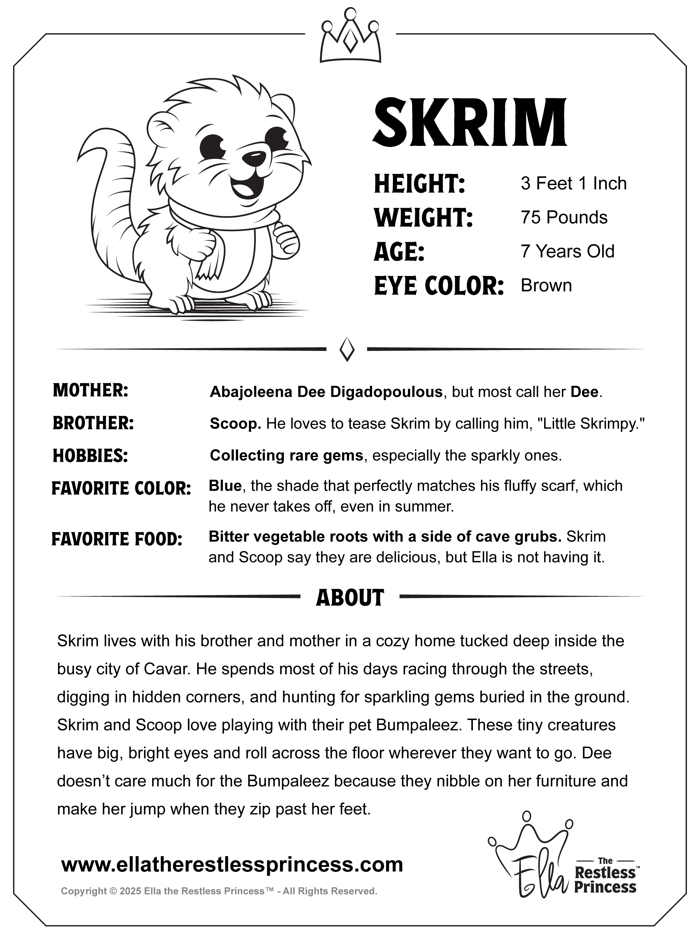 Skrim lives with his brother and mother in a cozy home tucked deep inside the busy city of Cavar. He spends most of his days racing through the streets, digging in hidden corners, and hunting for sparkling gems buried in the ground. Skrim and Scoop love playing with their pet Bumpaleez. These tiny creatures have big, bright eyes and roll across the floor wherever they want to go. Dee doesn’t care much for the Bumpaleez because they nibble on her furniture and make her jump when they zip past her feet.